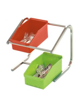 Praktiskt bestickställ gjord i helsvetsat rostfritt stål med plats för fyra besticklådor. Passar utmärkt till buffén, skollunchen eller andra platser där gäster själva plockar sina bestick. Robust konstruktion för Nordien-Systems besticklådor. Lådor ingår ej.