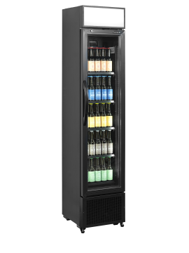 Slimmad drickakyl som passar verksamheter med ont om plats! Passar perfekt för exponering av t ex läsk och andra drycker. Försedd med glasad dörr, lystopp, inre vertikal LED belysning samt 5st flyttbara hyllor.