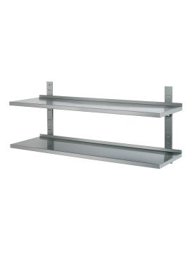 Hyllset i rostfri plåt med uppvikt bakkant. Levereras komplett med 2 par konsoler, 2 skenor och 2 hyllplan.